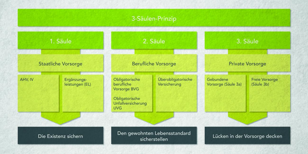 Die schweizerische Altersvorsorge ist auf dem 3-Säulen-Prinzip aufgebaut.