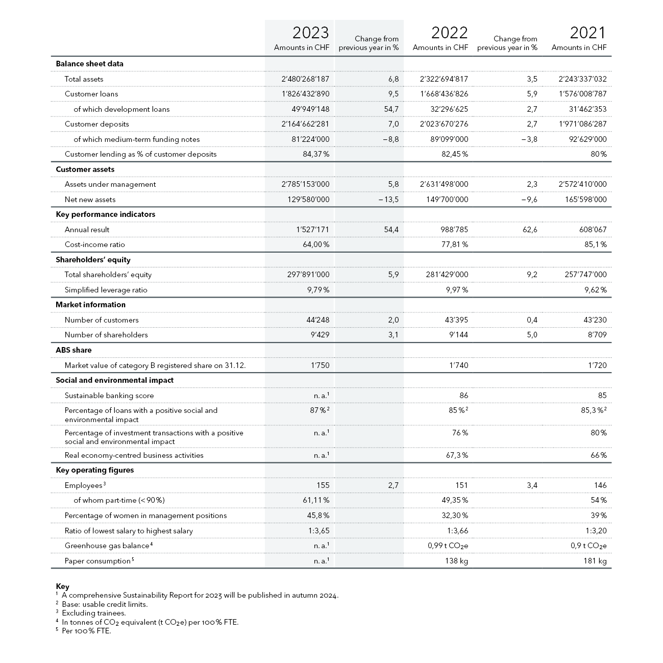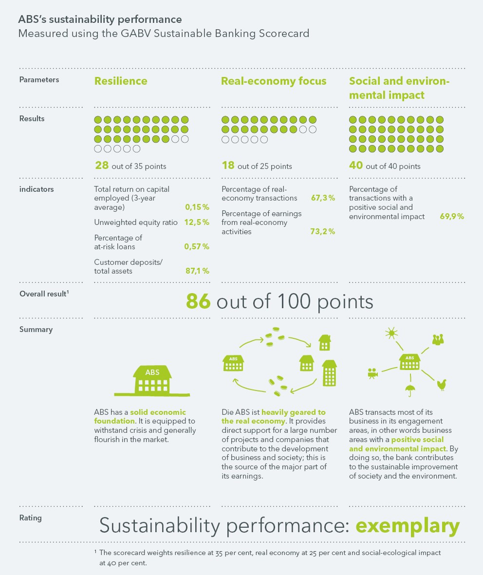 However, ABS attaches huge importance to transparency. This applies both to information on its own business activities, executive salaries (rather than just remuneration paid to committees, as is customary elsewhere) and critical examinations of its own actions (for example by means of external ethics audits). Transparency also means disclosing all loans that the bank awards so it is clear where the money that customers entrust to ABS is going.